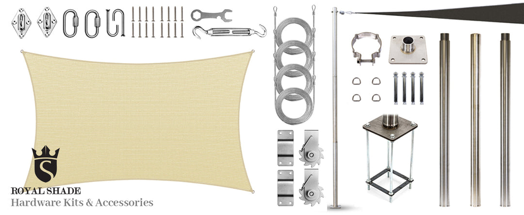 This is a ROYAL SHADE brand hardware set that accommodates their triangle shade sail. The hardware set is complete and will make hanging your sail a relatively simple endeavor. I would have preferred that Royal Shade put four anchors, rather than just the three, in a set so that it could be used with either a 3 or 4 corner sail. However, these are perfect for the triangular sail.