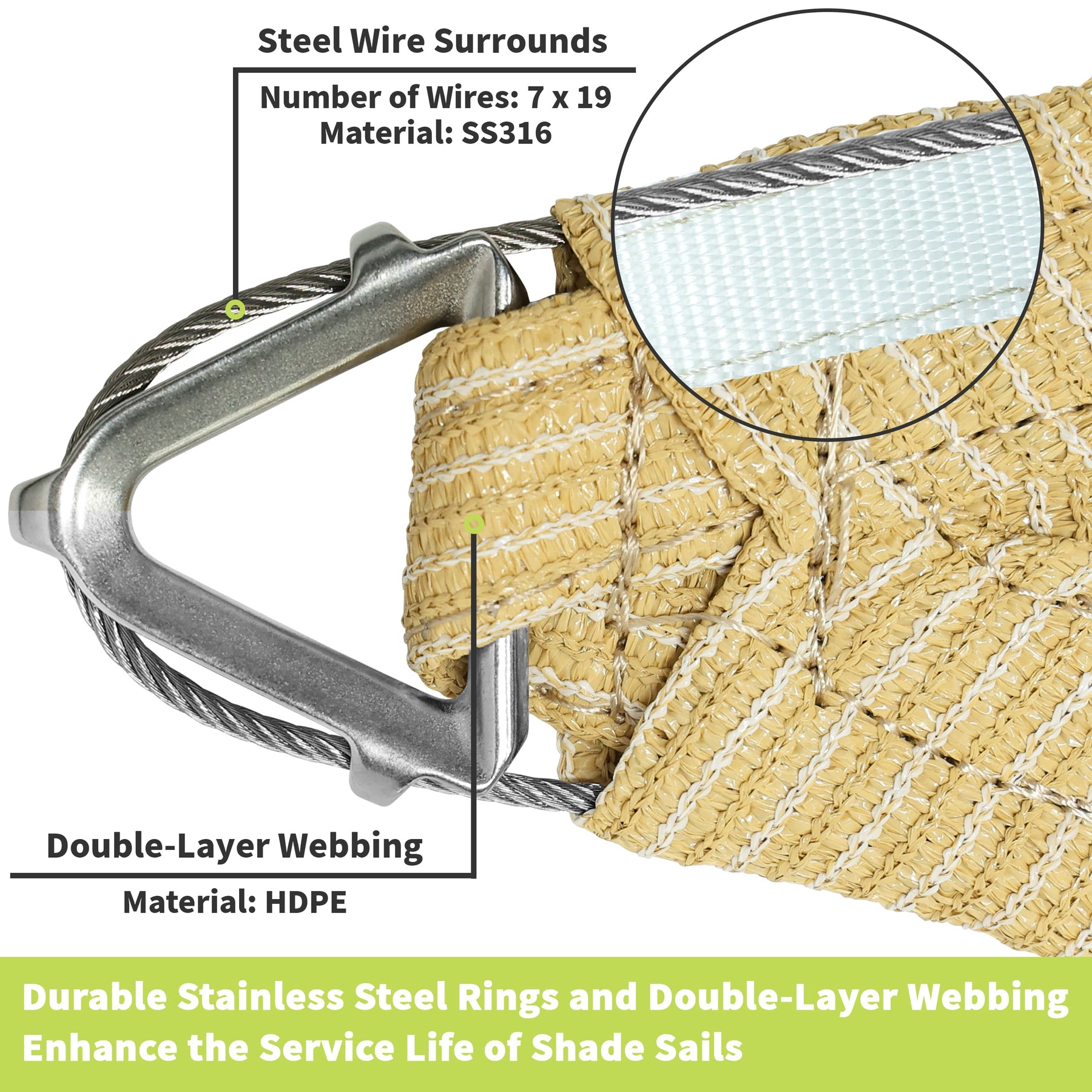 Durable Corner Rings: Royal ShadePro Ring Durable Sun Shade Sail Crafted with 316 stainless steel concave triangular rings at each corner. Equipped with 3 arched holes to enhance the stability of steel cables. Designed for secure connections, our shade sail withstands various weather conditions.